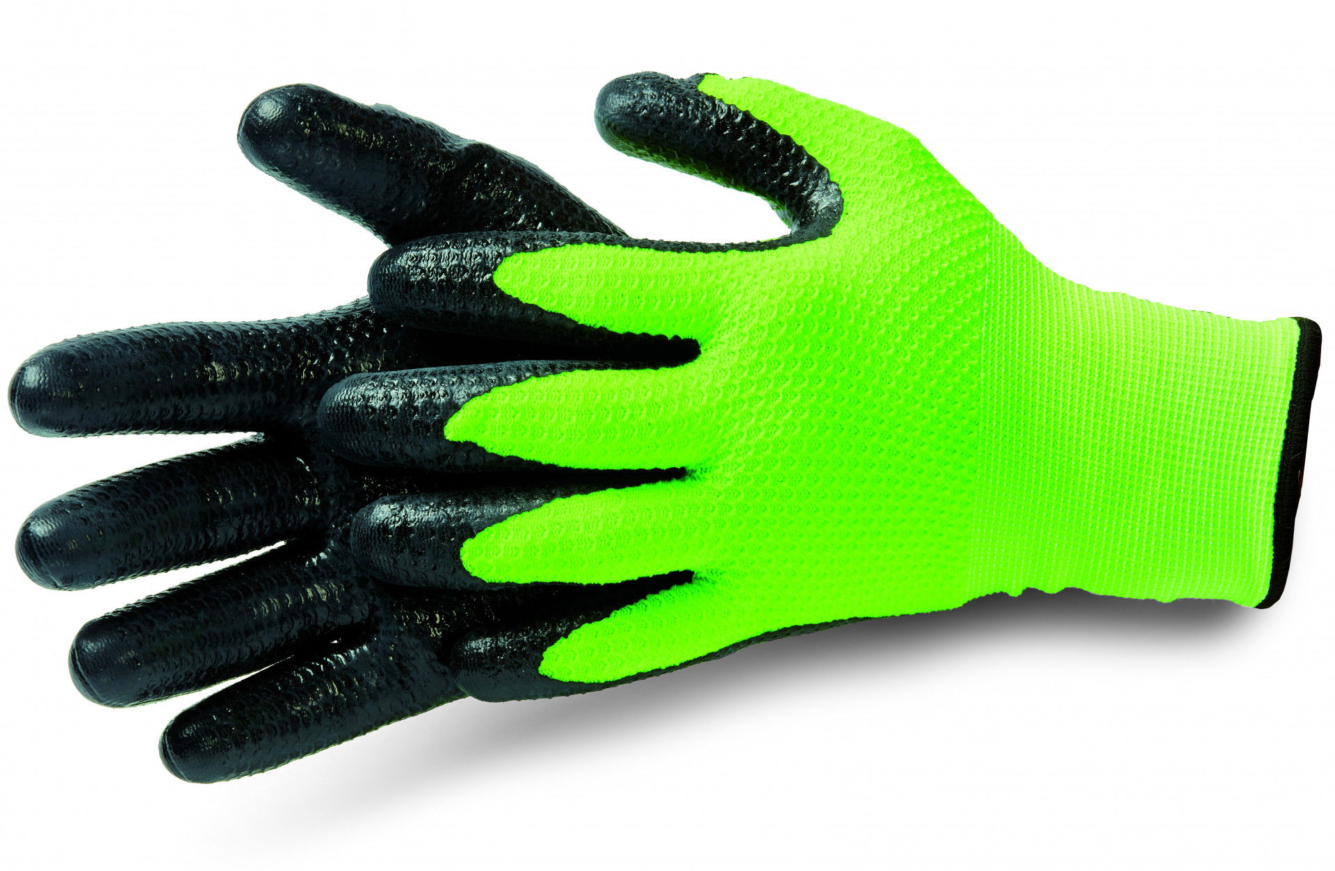 - Univerzális kesztyű elasztikus finomkötött anyagú béléssel és sima, méhsejt formájú nitril bevonattal.